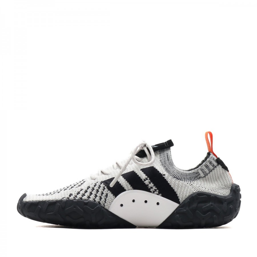 Es verfügt über ein volles Grau Primekit Obermaterial, einen sockenähnlichen Knöchelkragen, gepaart mit Schwarz Three Stripes an den Seiten und eine robuste Gummiaußensohle. Ein orangefarbener Heel-Tab für den Rücken verleiht dem Schuh einen schönen zusätzlichen Kontrast.