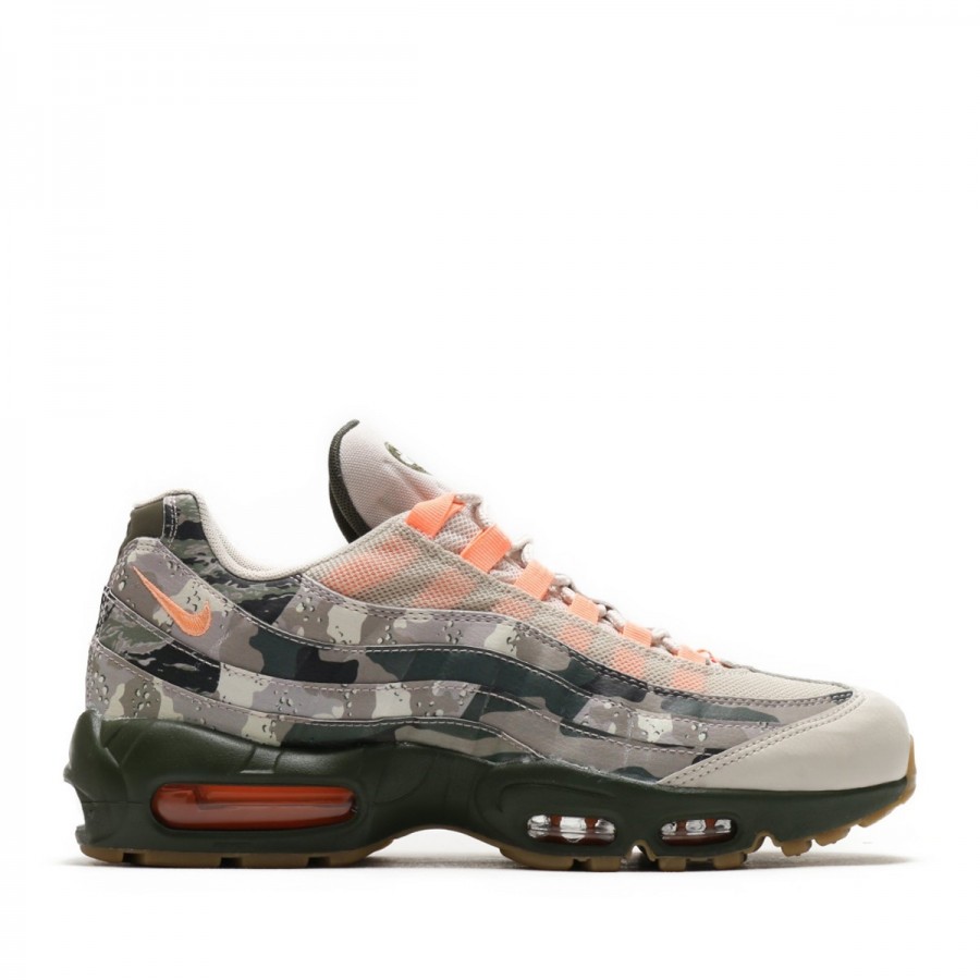 Cette itération Nike Air Max 95 est disponible dans des tons de sable avec des détails de camouflage couvrant la majorité des schuh. D'autres détails incluent des accents de Rosa sur les logos de Swoosh, des boucles de lacet et une unité de semelle Air Max. Finition de la conception est une semelle intercalaire en Olive et en caoutchouc Braun, avec deux ensembles de lacets.