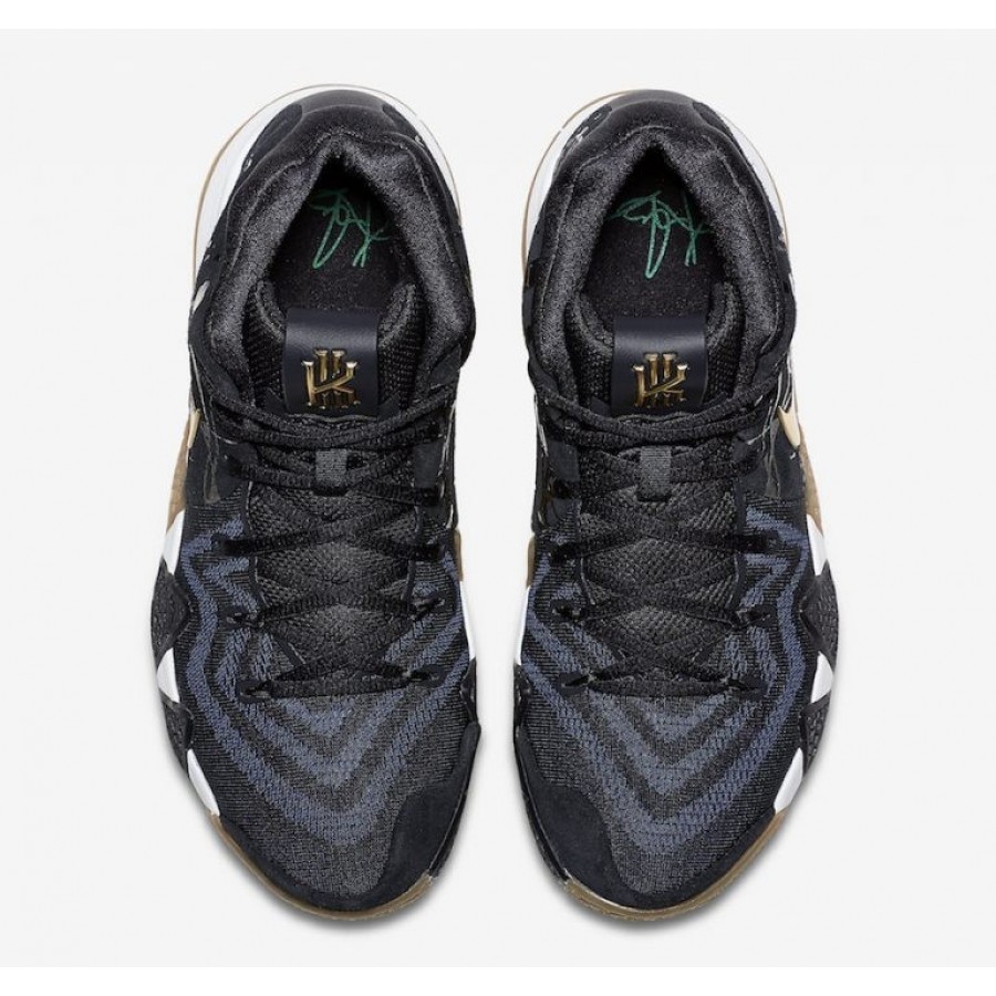 Vêtu d'un jeu de couleurs Pitch Blau et Metallisch Gold. Ce Nike Kyrie 4 est livré avec des rayures contrastantes sur la zone des orteils et une impression graphique en relief autour du talon. Les logos Nike Swoosh de Metallisch Gold, une semelle intercalaire en Weiß, sont des créations de Celtics Grün sur une semelle extérieure en caoutchouc Braun qui complète le design.