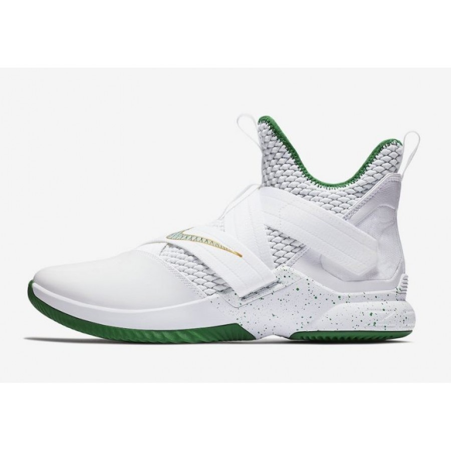 Cette itération de la LeBron Soldier 12 arbore une tige Weiß propre associée à des accents contrastés Grün apparaissant sur l'image de marque, la doublure de la chaussette, la semelle intercalaire mouchetée et la semelle extérieure. Le logo signature Dunkman de LeBron James est sur les talons, tandis que les logos SVSM dans la semelle intérieure et la marque irlandaise sur l'onglet languette complètent le design.
